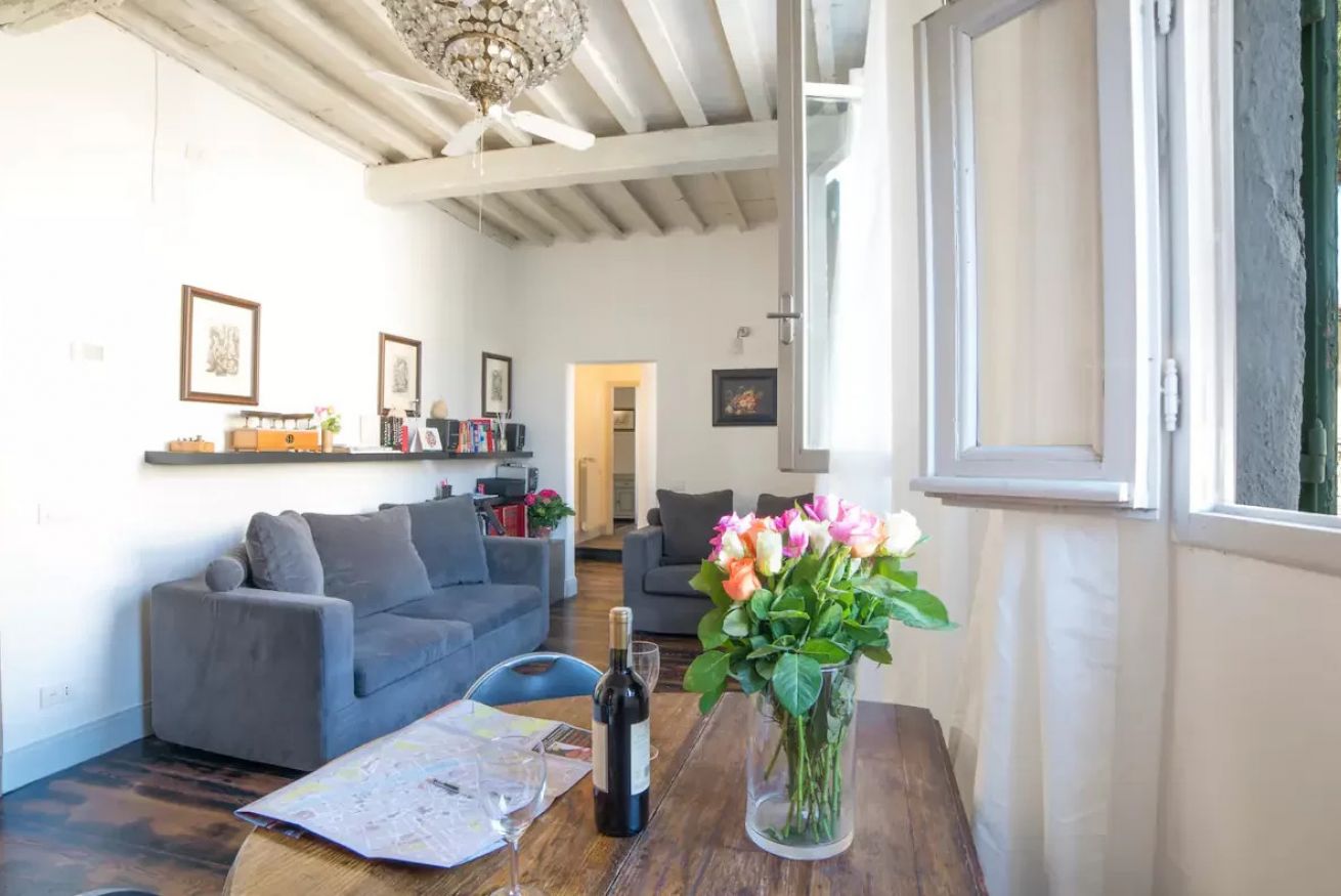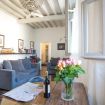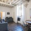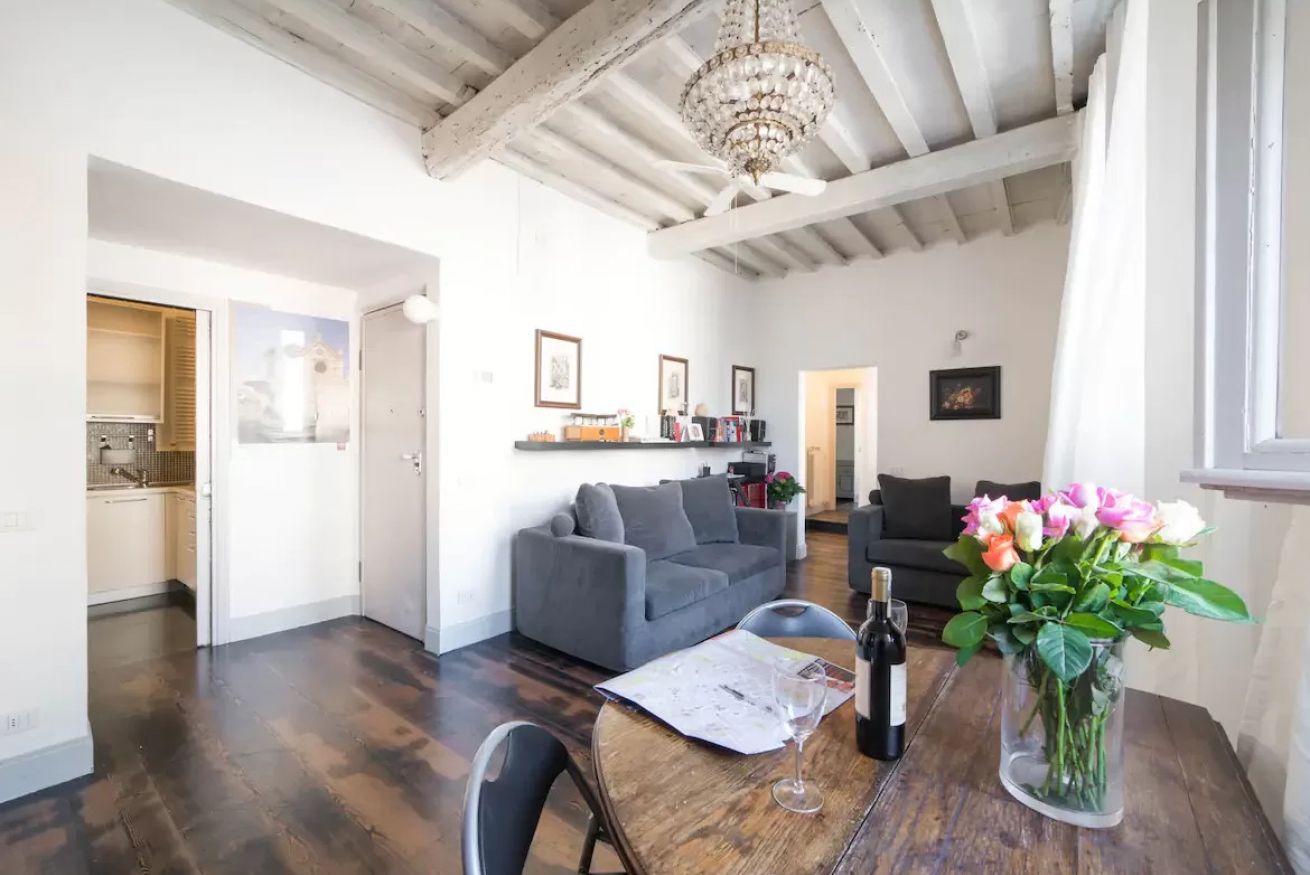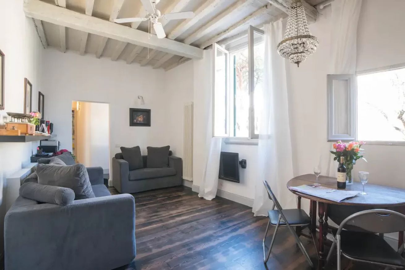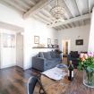 Accogliente appartamento con travi a vista e pavimento in legno, composto da un salotto con divano letto matrimoniale, tavolo da pranzo, aria condizionata.